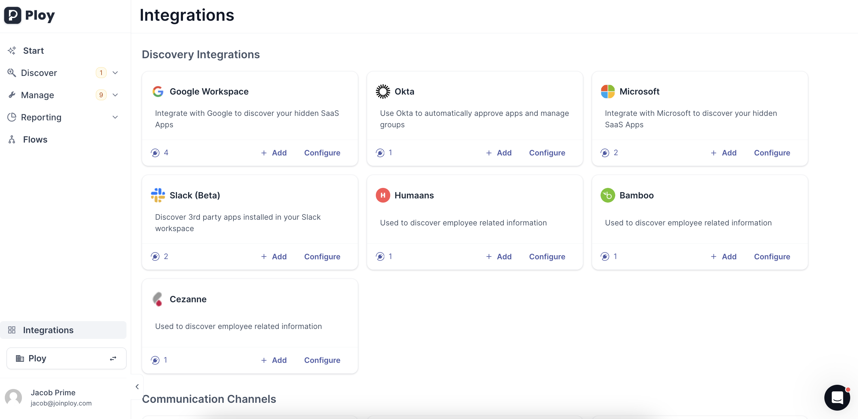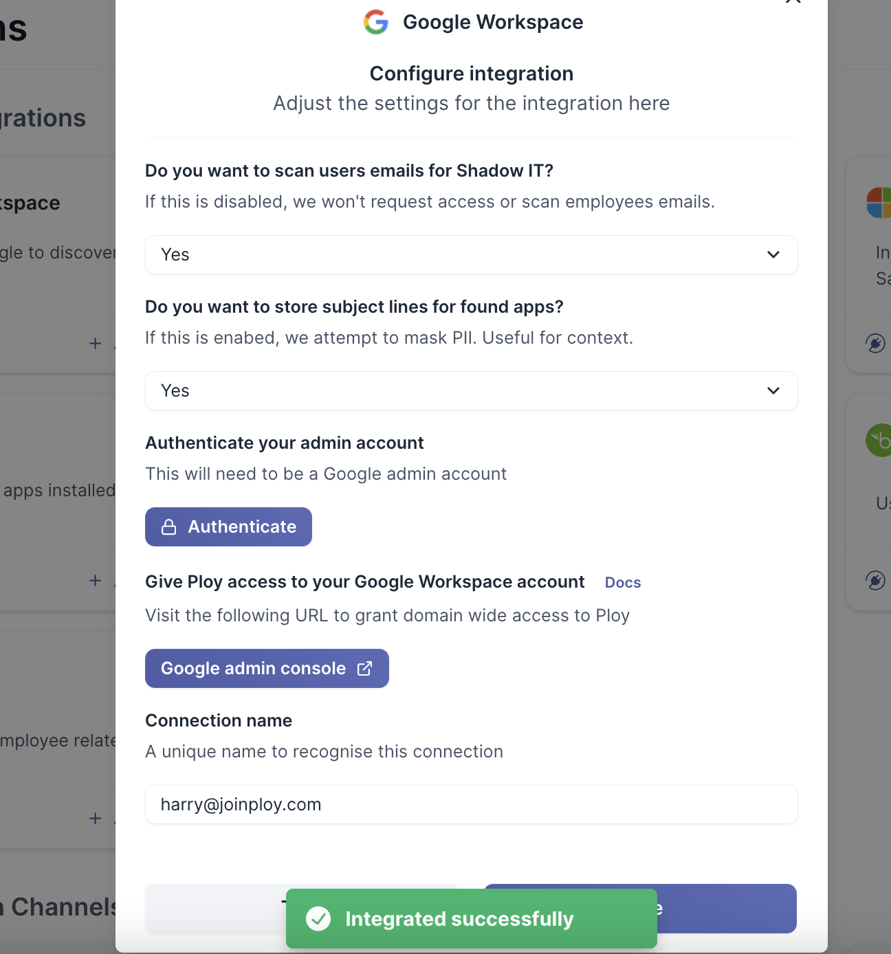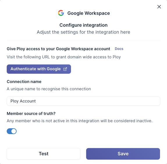 Navigate to the integrations page in the bottom left of Ploy and select the Google Workspace integration.