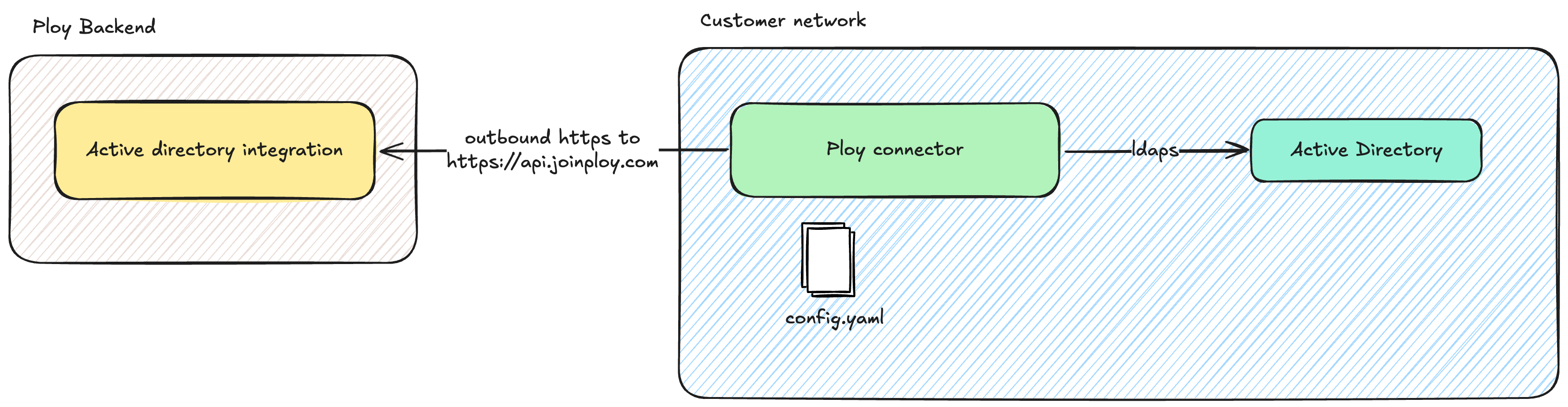 The Ploy Connector needs network access to the Active Directory server you wish to connect to Ploy. It can connect using ldaps or ldap+starttls.